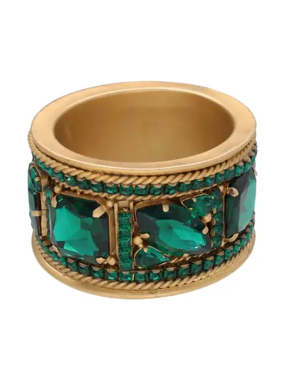 circa 2023 gold metal band green stones rhinestones various shapes sizes rope design detail Condition: GOOD. This previously owned and used item is in good condition with minimal signs of use. This may include fading of material or plating and scratches.