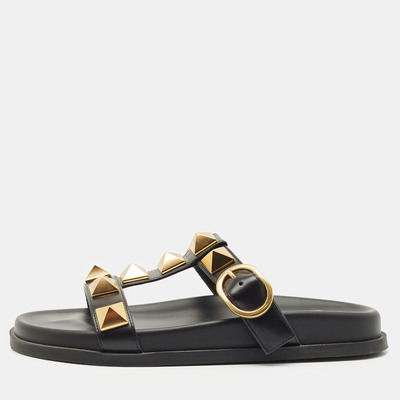 These Valentino slide sandals feature oversized Roman studs on smooth black leather straps. A bold, flat silhouette with effortless summer appeal.