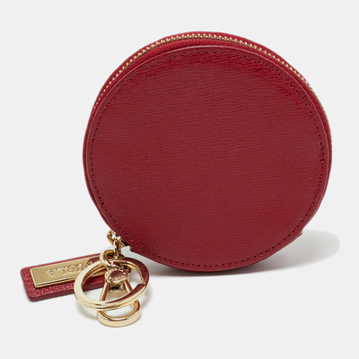 Compact yet striking, this Furla coin purse in vivid red leather brings both charm and functionality to your everyday essentials. Its round silhouette and polished zip closure are perfectly accented by the attached keychain, making it an ideal accessory to clip onto bags or carry solo for quick errands.