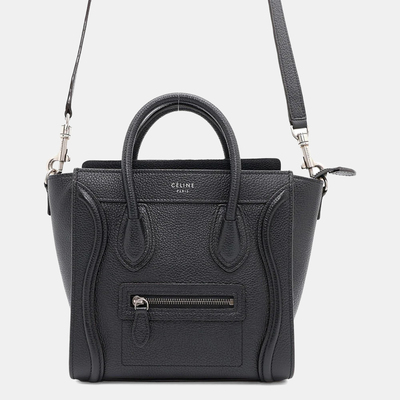 Celine reimagines its iconic silhouette in compact form with the Black Leather Nano Luggage Shopper Tote, showcasing bold lines, a front zip pocket, and structured handles. Sleek and versatile, it blends architectural style with everyday functionality.