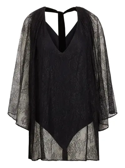 black lace design cape sleeves V-neck tie fastening sheer overlay Just a reminder that this piece must be tried on over your own garments.