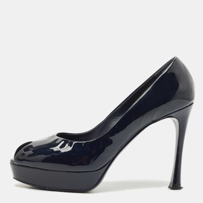 Yves Saint Laurent Navy Blue Patent Leather Peep Toe Ankle Strap Pumps Size 37 1175001 (lpn30134018)