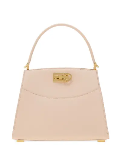 beige single flat top handle two adjustable detachable shoulder straps Gancini flip-lock fastening main compartment