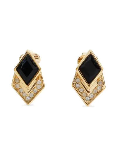 circa 1980-1990s gold plated black stones rhinestone embellishments geometric shape clip-on earrings Condition: GOOD. This previously owned and used item is in good condition with minimal signs of use. This may include fading of material or plating and scratches.