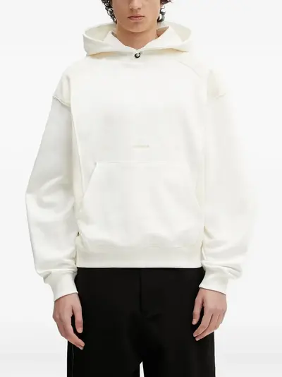 ivory hooded neckline mixed-fabric panelling kangaroo pocket dropped shoulders long sleeves fringed label and embroidery at the back