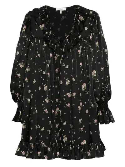black floral print ruffled neckline ruffled hem long sleeves collar tie fastening
