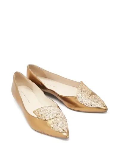 gold-tone leather butterfly wing detail crystal embellishment pointed toe metallic finish Condition: GOOD. This previously owned and used item is in good condition with minimal signs of use. This may include fading of material or plating and scratches.