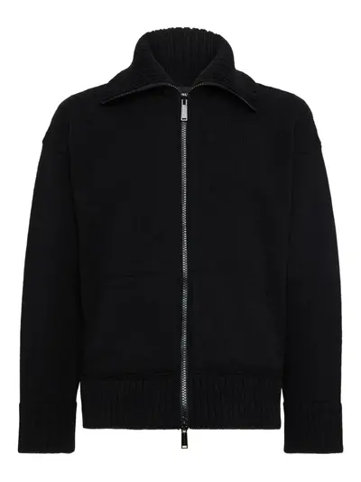 black front two-way zip fastening two front pouch pockets jacquard logo motif ribbed trim