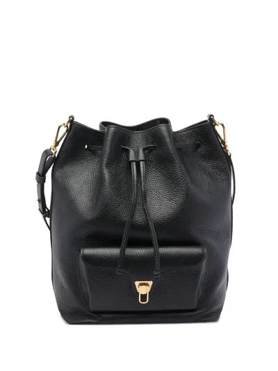 black calf leather drawstring closure external pocket turn-lock closure detachable strap