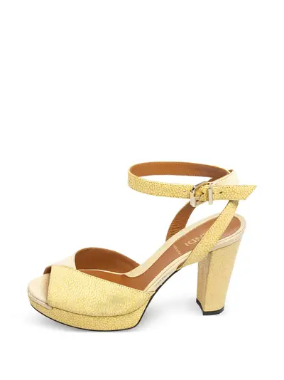 yellow calf leather platform sole block heel ankle strap peep toe Condition: GOOD. This previously owned and used item is in good condition with minimal signs of use. This may include fading of material or plating and scratches.