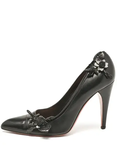black leather pointed toe slender heels flower embellishments leather flowers adorn toe and vamp Condition: GOOD. This previously owned and used item is in good condition with minimal signs of use. This may include fading of material or plating and scratches.