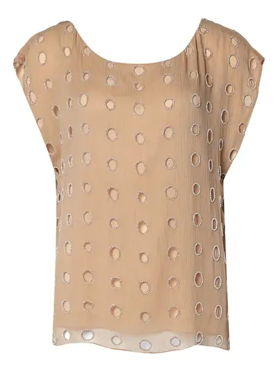 circa 2024 beige silk circular cutouts bead embellishments pattern features regularly spaced circles each circle outlined beads Condition: GOOD. This previously owned and used item is in good condition with minimal signs of use. This may include fading of material or plating and scratches.