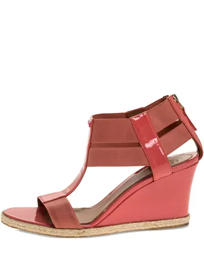 pink patent leather elastic straps t-strap design wedge heel jute sole Condition: GOOD. This previously owned and used item is in good condition with minimal signs of use. This may include fading of material or plating and scratches.
