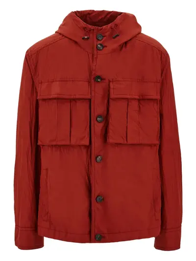 red drawstring hood flap pockets button fastening concealed zip fastening