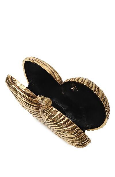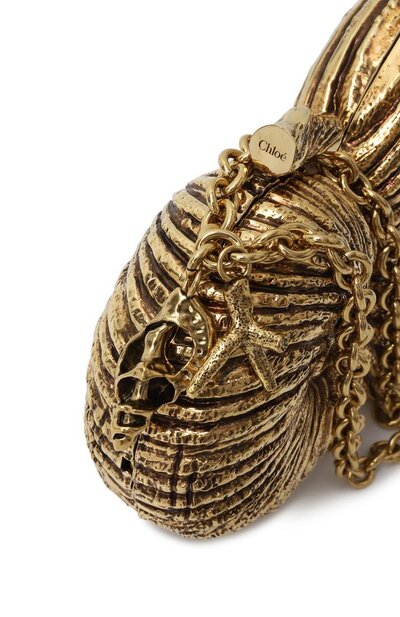 Сумка Sea Treasures в форме морской раковины станет акцентом как в дневном, так и в вечернем образе. Аксессуар из искусственно состаренного металла застегивается брендированной защелкой. Клатч с подкладом из кожи ягненка дополнили ремнем-цепочкой с подвесками в виде ракушки и коралла.