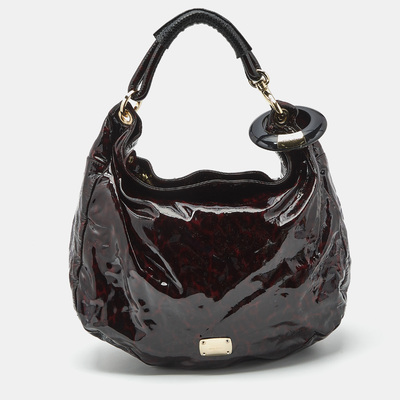 The Sky Bangle hobo from Jimmy Choo is rendered in glossy patent leather with a leopard print thats muted. Its complete with a single handle and a signature ring detail.
