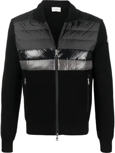 jet-black/dark-grey cotton-blend funnel neck front zip fastening long sleeves logo patch at the sleeve down-feather filling
