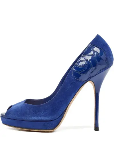 blue suede exterior peep toe design high heel platform sole patent leather rose embellishment Condition: GOOD. This previously owned and used item is in good condition with minimal signs of use. This may include fading of material or plating and scratches.