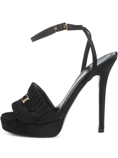 black satin finish pleated detailing buckle detail ankle strap high heel platform sole Condition: GOOD. This previously owned and used item is in good condition with minimal signs of use. This may include fading of material or plating and scratches.