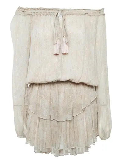 beige off-shoulder neckline tiered ruffle hem metallic thread detailing pink tassels waist silk lurex fabric Condition: GOOD. This previously owned and used item is in good condition with minimal signs of use. This may include fading of material or plating and scratches.