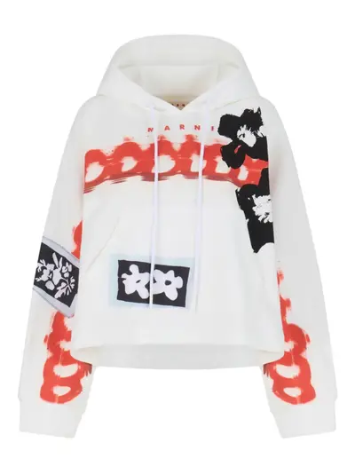 white bold graphic print front pouch pocket adjustable drawstring hood oversized sleeves logo detailing