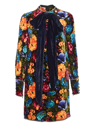 black and multicoloured floral print velvet navy velvet bow crystal embellishments at cuffs crystal embellishments at hem neckline crystal embellishments
