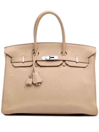 This Birkin 35 features a Togo leather body in Trench color, rolled leather handles, a front flap with turn-lock closure, and interior slip and zip pockets. Brown. Serial Number: □L. Inclusions: dust bag, charm, padlock, key. Condition: GOOD. This previously owned and used item is in good condition with minimal signs of use. This may include fading of material or plating and scratches. Please refer to the photos on this product page for a detailed view of the item, including any damages declared.