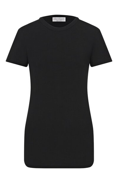 Однотонная черная футболка из весенне-летней коллекции – универсальный солдат в базовом гардеробе. Мастера марки, основанной Брунелло Кучинелли, выполнили модель из тонкого джерси. Материал из длинных хлопковых волокон особенно приятный на ощупь, хорошо тянется, но не теряет форму со временем.