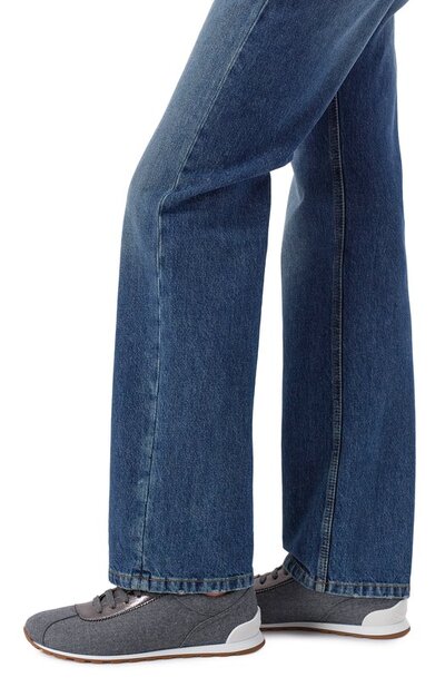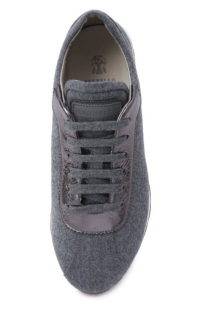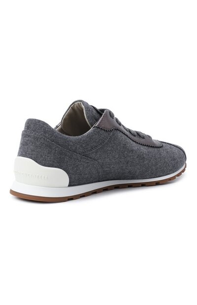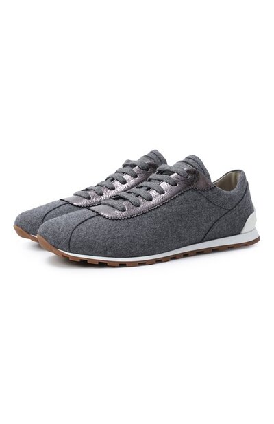 В коллекцию Active вошли кроссовки из фланели на основе шерсти первого пострига. Кашемировую шнуровку укрепили ламинированной телячьей кожей, поддержав ее блеск цепочкой мониль на язычке с брендированным патчем. Пару с внутренней отделкой из твила и полимерной накладкой на заднике поставили на двухслойную подошву с протектором.