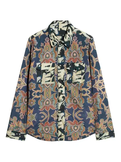 dark-blue tapestry pattern long sleeves button fastening chest pockets collared neck