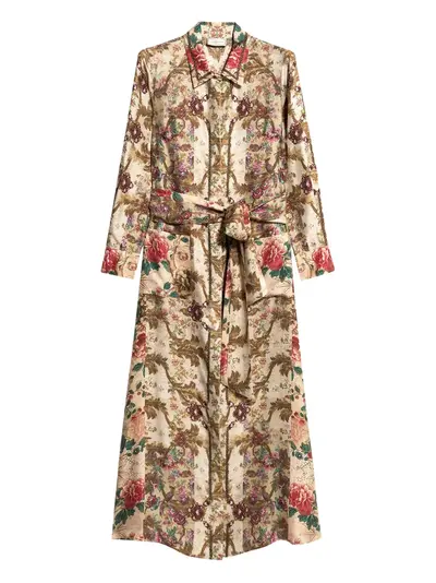 beige floral print belted waist long sleeves collared neckline button fastening
