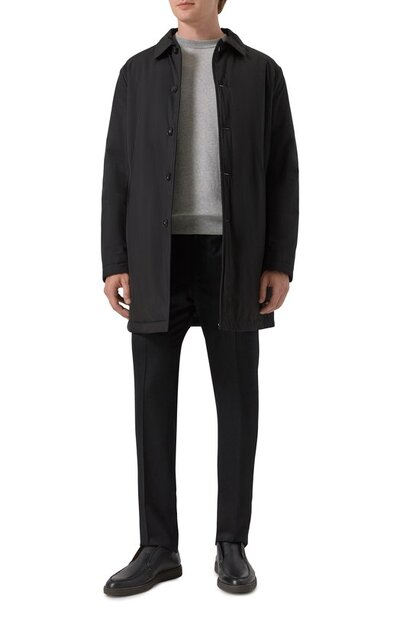 Для пошива плаща прямого кроя использовали полиэстер, из которого выполнили и подкладку изделия. Модель с двумя боковыми карманами застегивается пуговицами в тон.