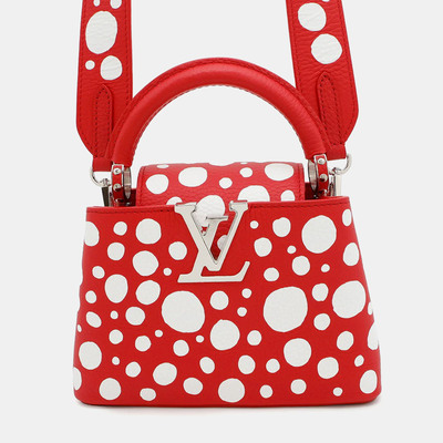 From the LV x Yayoi Kusama collection, this Capucines Mini in red calf leather features her iconic Infinity Dots. A collector’s piece with artistic flair, it includes a top handle and a crossbody strap.