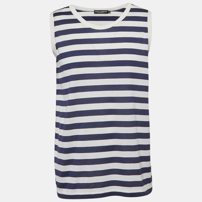 Nautical vibes meet modern chic in this sleeveless tee by Dolce and Gabbana. Crafted in soft jersey with bold blue and white stripes, its a playful and polished take on casual dressing—ideal for layering or sun drenched escapes.