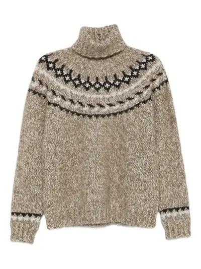 beige high neck Fair Isle pattern long sleeves ribbed cuffs and hem