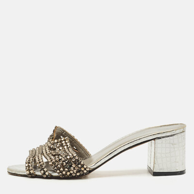 Gina Silver Croc Embossed Leather Crystal Embellished Slide Sandals Size 38.5 1180597 (lpn30549705)