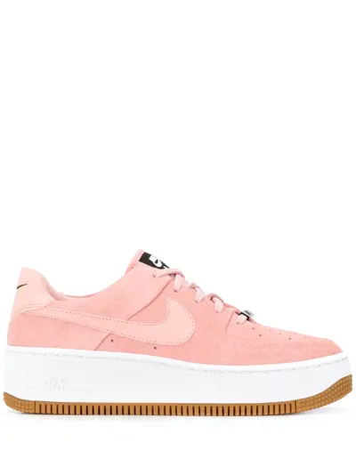 Pink suede platform sole sneakers from Nike featuring a signature Nike swoosh, a perforated detail, a lace-up front fastening, a logo patch at the tongue, a round toe and a white rubber sole.