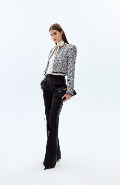 Блузу с объемными рукавами и запахом, формирующим глубокий V-образный вырез, выполнили из шелка. Модель с эластичным поясом дополнили завязывающимися на горловине лентами.
