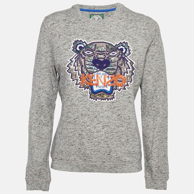 Iconic and fierce, this Kenzo sweatshirt features the brand’s signature tiger motif embroidered in vibrant detail against a grey cotton base. With a classic crew neck and ribbed trims, it fuses comfort and streetwear attitude effortlessly.