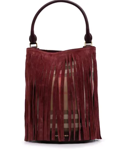 canvas body with leather trim and suede fringe details rolled leather handle open top with magnetic snap closure interior slip pocket pouch inclusion red Serial Number: ITCF&10SCA Inclusions: pouch. Condition: GOOD. This previously owned and used item is in good condition with minimal signs of use. This may include fading of material or plating and scratches. Please refer to the photos on this product page for a detailed view of the item, including any damages declared.