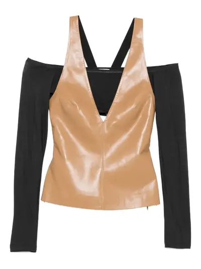 light brown halterneck design off-the-shoulder sleeves black long sleeves