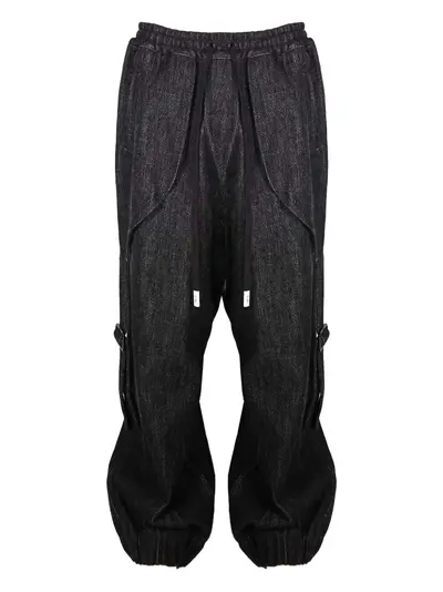 black embroidered logo drawstring waist side buckle straps cargo pockets cuffed hems