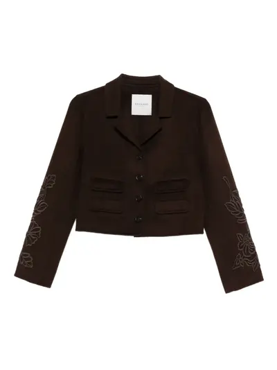 brown floral embroidery multiple pockets cropped length button fastening notched lapel