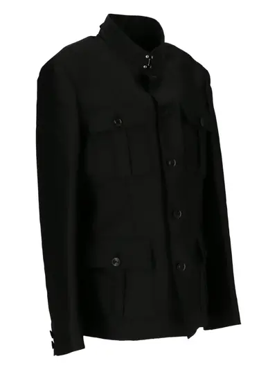 black mandarin collar flap pockets button fastening long sleeves