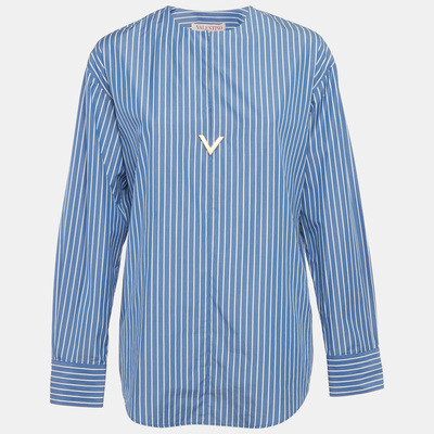 This feminine blouse by Valentino features subtle stripes and a logo plaque accent, blending classic shirting with contemporary elegance. Lightweight and polished, it’s an everyday luxury essential.