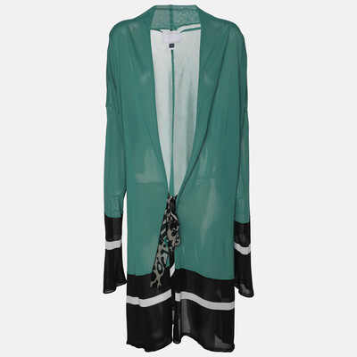 This long open cardigan by Class by Roberto Cavalli features a green and black knit pattern with fluid drape. Perfect for transitional layering, its relaxed silhouette adds texture and warmth. Pair with tailored trousers or a sleek dress for a refined yet effortless daytime ensemble.