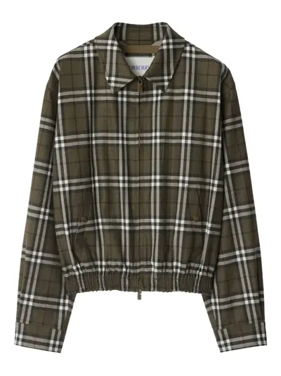 olive green all-over checked pattern point collar elasticated hem front zip fastening long sleeves