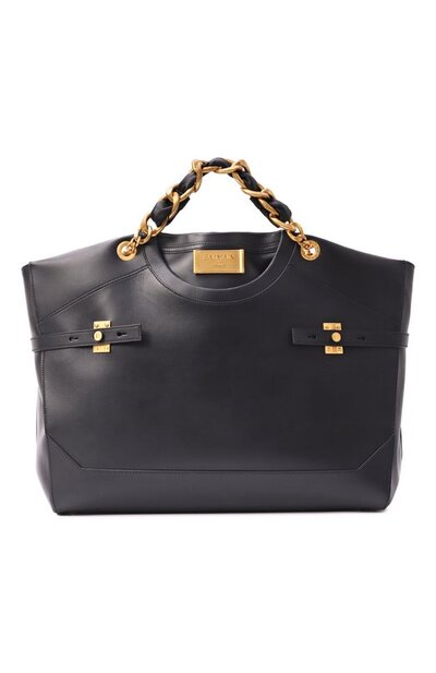 Сумку Crewneck с комбинированными ручками разной длины и боковыми ремешками, регулирующими объем изделия, выполнили из телячьей кожи. Спереди модель украсили металлической пластиной Balmain Couture, а дно дополнили пуклями. Аксессуар с внешним карманом и внутренними закрывается магнитной кнопкой.