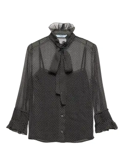 black front button fastening ruffled trim gathered tie neck long sleeves