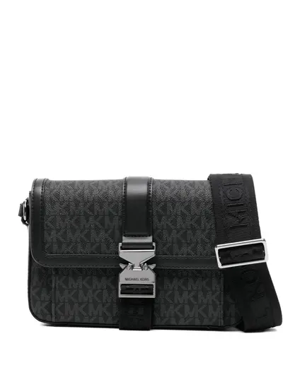 black front buckle fastening front flap closure adjustable shoulder strap main compartment